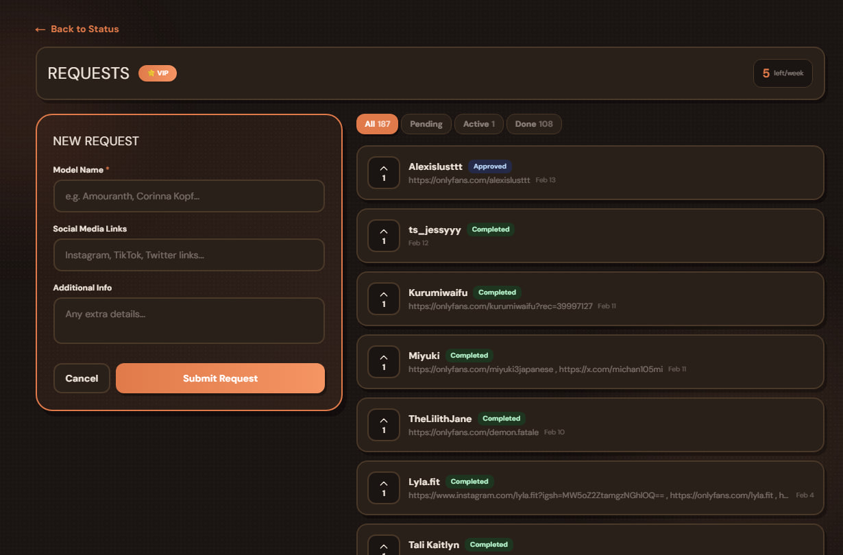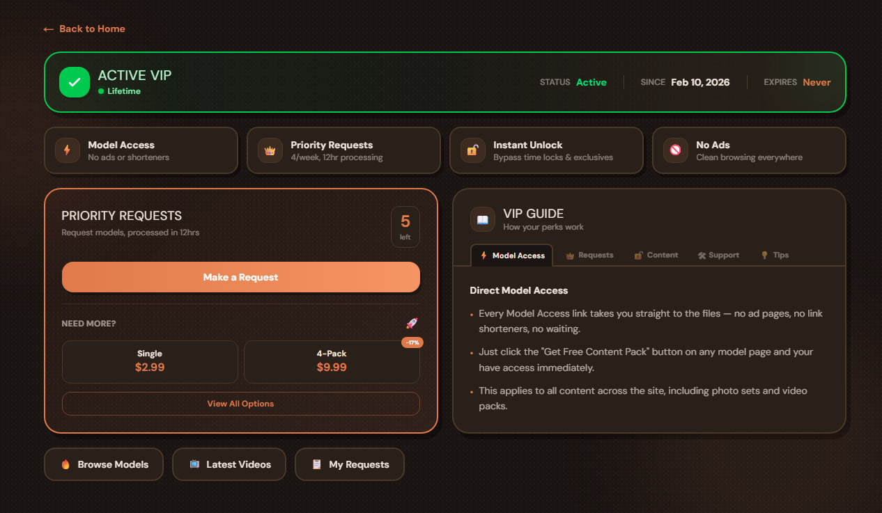 After purchasing, verify your VIP status on the VIP Dashboard. This page confirms your active plan and remaining days, but also lets you make Priority Requests, read admin messages, and access exclusive mini-guides.